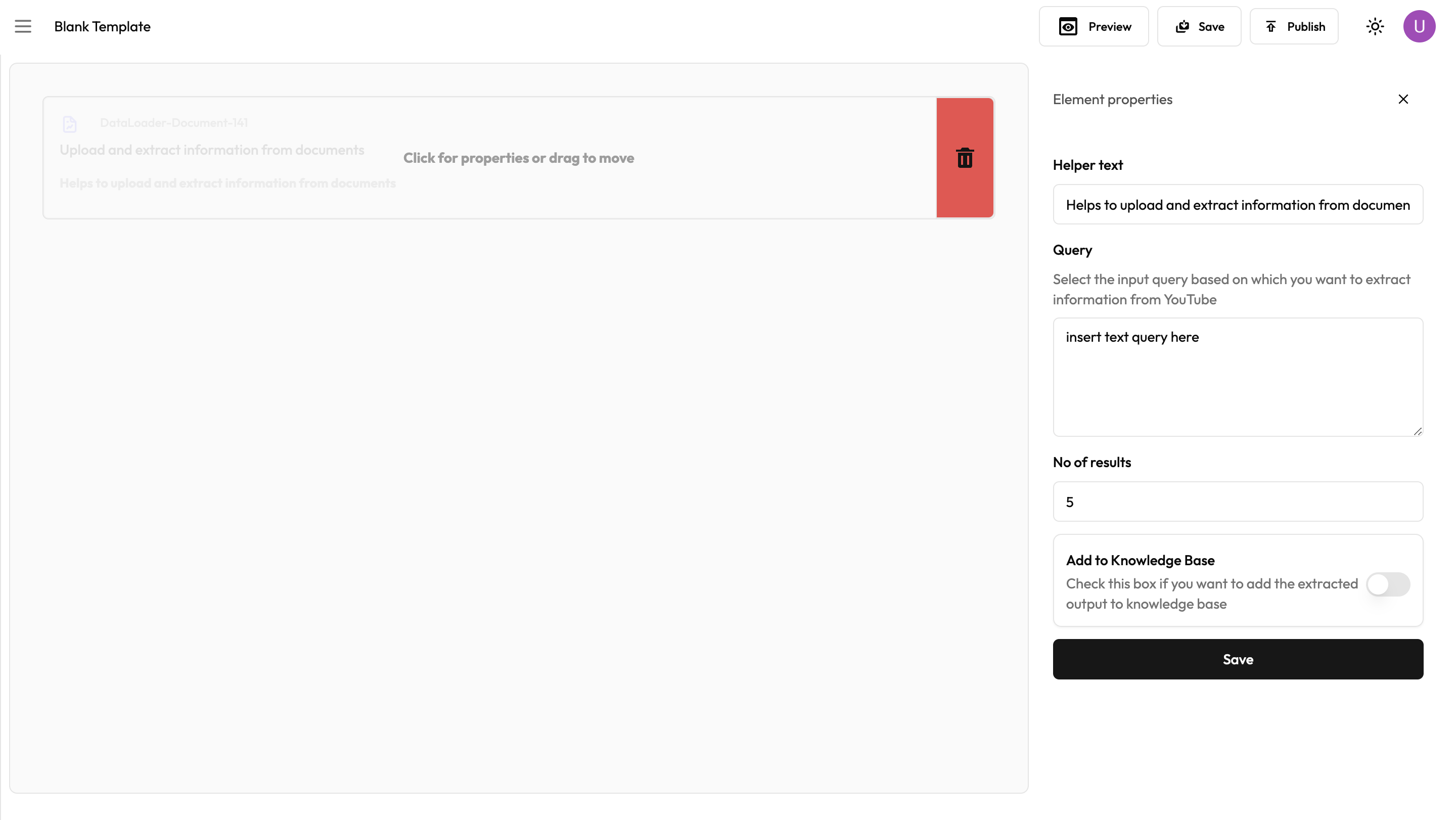 The UI data loaders functions same as the ones available for knowledge base retrievers. The advantage of UI data loader over knowledge base is that it gives the flexibility for the frontend users to add their own document in the workflow for processing. Admin can also select if they want the documents uploaded by the users to be added to knowledge base or not for future processing. Similar to the knowledge base loaders, admin can either add static query for information retrieval or pipe variable from the workflow.